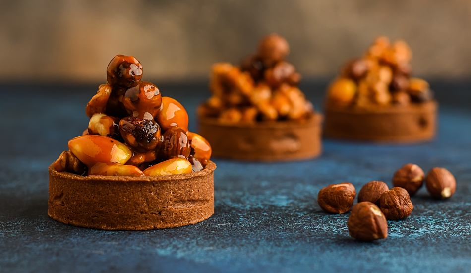 - Vul ze met de frangipane en verdeel er de gehakte noten over. Bak de taartjes 15 minuten in de oven.