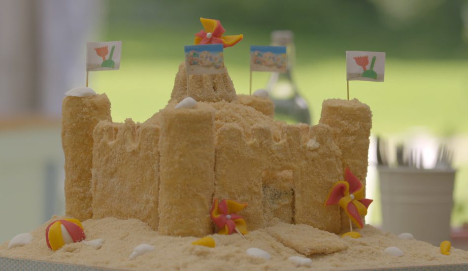 - Maak van fondant en marsepein decoraties zoals schelpen, strandballen, molentjes en zet deze op en rond het kasteel.