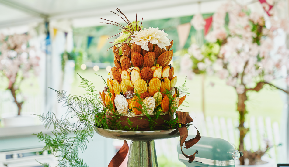 - Verdeel de eetbare bloemen over de madeleine toren om de lege plekken op te vullen.