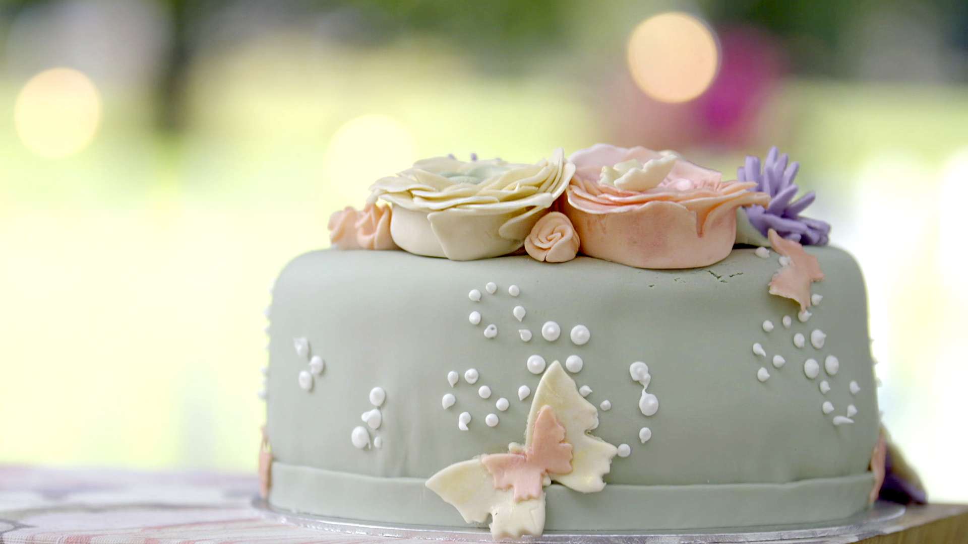 - Decoreer de taart met de bloemen, blaadjes en vlinders van fondant.