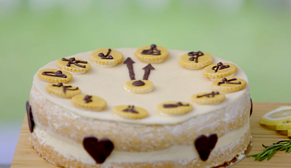 - Plak het rondje met botercrème in het midden van de taart en de wijzers op 5 minuten voor 12.