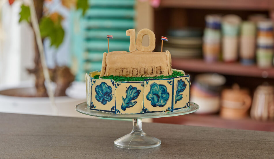 Een écht Hollandse taart, dit exemplaar met Delfts blauwe tegels. Hij smaakt lekker romig door de roomkaas frosting.