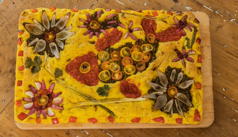 - Gebruik de verschillende chutney’s als achtergrond van de bloem door deze in een cirkelvorm op de focaccia te smeren.