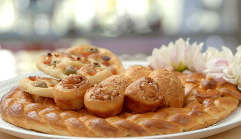 - Sla het deeg zachtjes plat en rol uit, snij in zes lange delen. Rol op als een worstje en knoop creatief dicht.