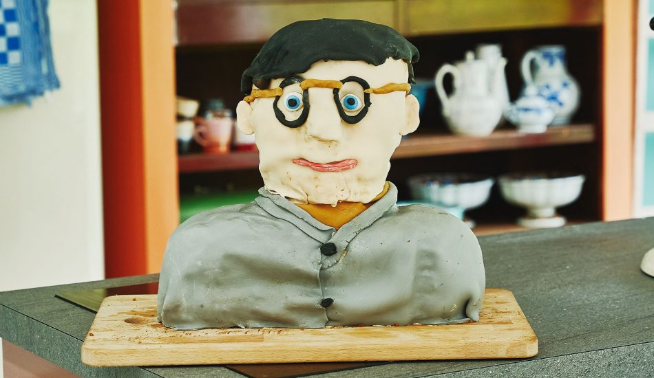 Meneer de Bok in een tiramisu-jasje. Deze taart bestaat uit koffiecake, mascarpone-amarettocrème en praliné botercrème. Robèrt vindt het een fantastische taart. Zo een waar je steeds weer een hapje van wilt nemen.