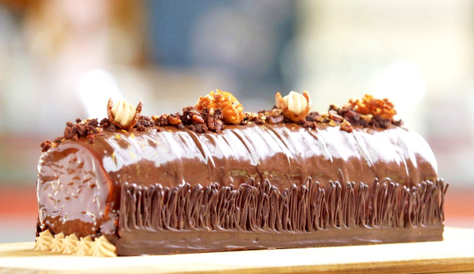 - Laatste laag biscuit en buche in de shockvriezer zetten.