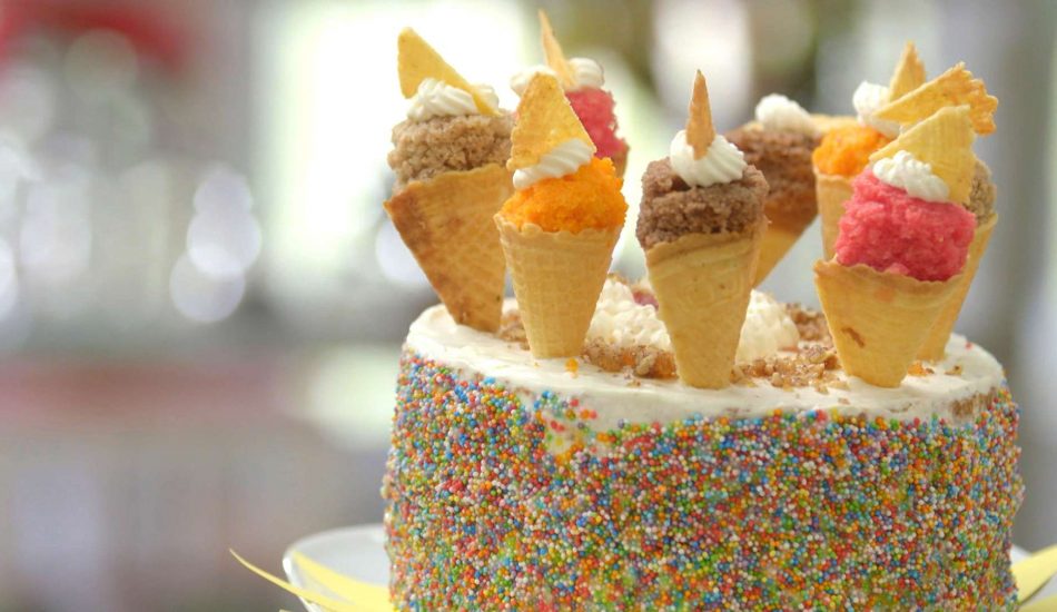 - Stapel de taarten zo op dat het bolletje op het ijshoorntje komt en het waterijsje op het stokje.
