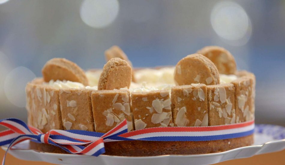 - Zet de op de maat gesneden Jan Hagelkoekjes met de bestrooide (amandelschaafsel en parelsuiker) kant naar buiten tegen de binnenkant van de taartring aan.