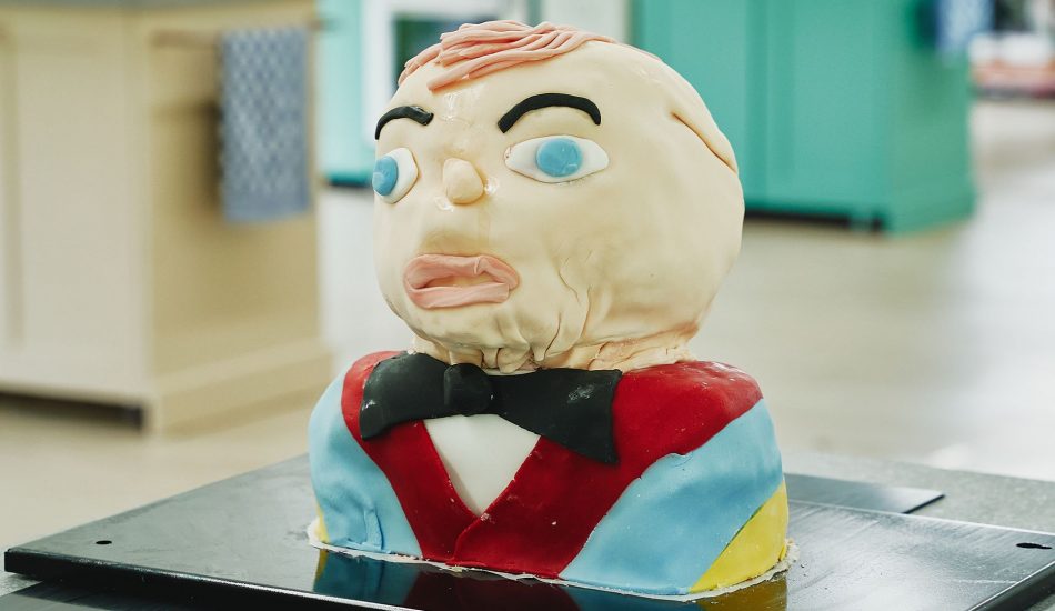 - Maak de contouren van het hoofd en schouders met een kartelmes in de cake en smeer af met botercrème.