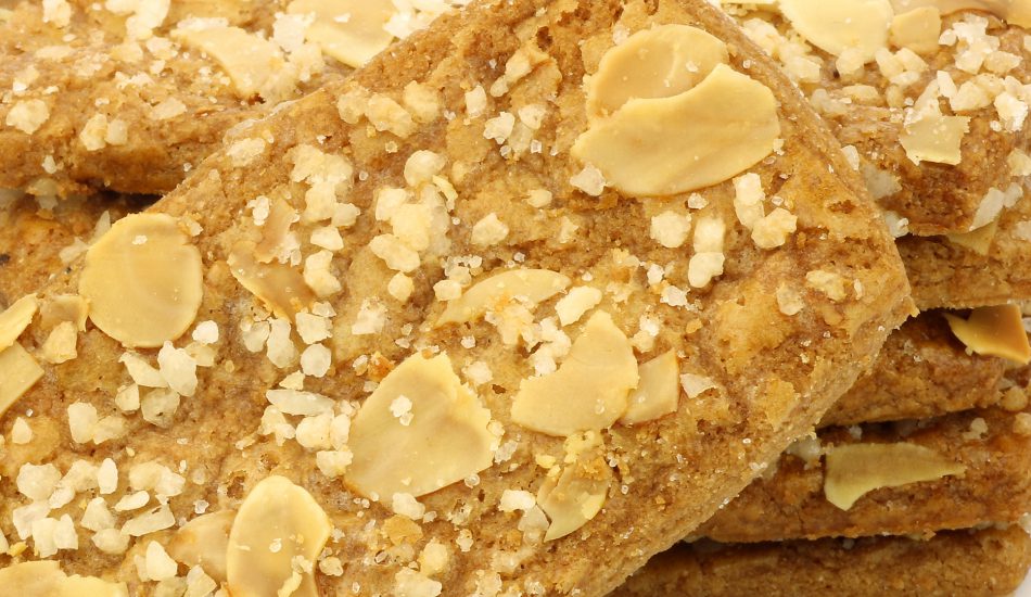 - Als de koek uit de oven komt, snijd deze gelijk in repen van 3 bij 7 centimeter, je kunt dit het beste doen met een pizzames