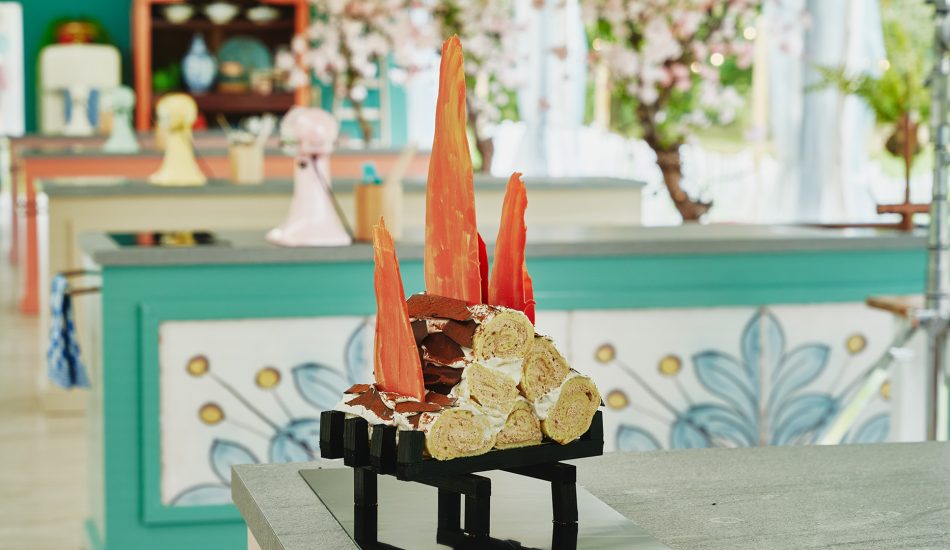- Stapel de rollen netjes op elkaar en vul de gaten op met kastanje chantilly.