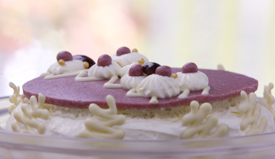 - Haal de taart uit de koeling en spuit met de rest van de witte chocolade decoratieve strepen op het marsepein.