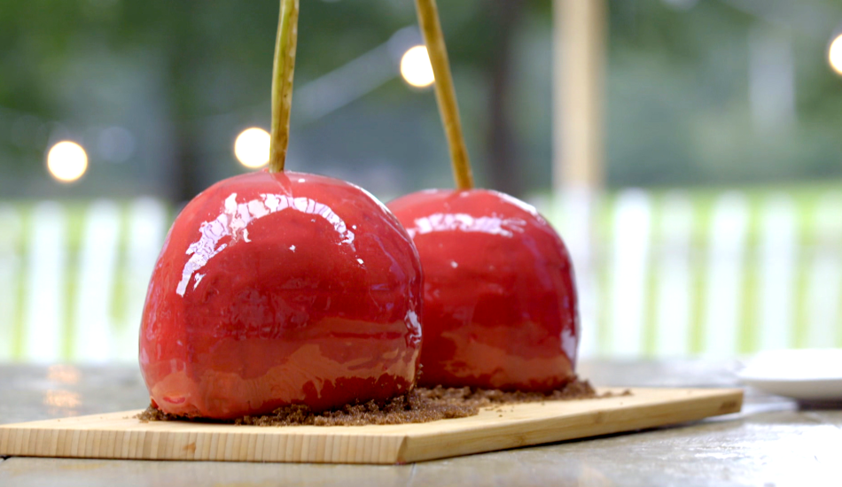 - Giet eerst de licht rode glazuur en daarna de donkerrode glazuur over de kersen.