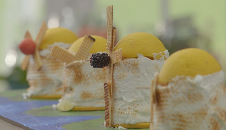 - Bestrijk een reep met limoenjam voor de witte molen.