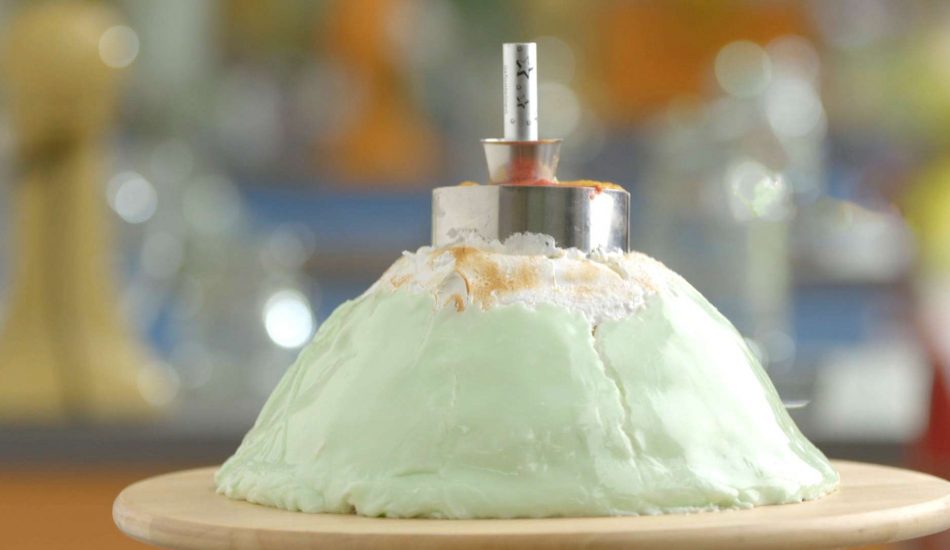 - Plaats een ring (of maak deze evt. van witte chocolade) en giet beide purees hierin. Het beoogde effect: als de ring wordt verwijderd lopen beide kleuren door elkaar naar beneden, als lava.