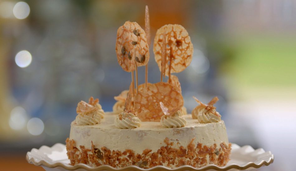 - Spuit de mokkacrème op de taart en strijk glad af.
