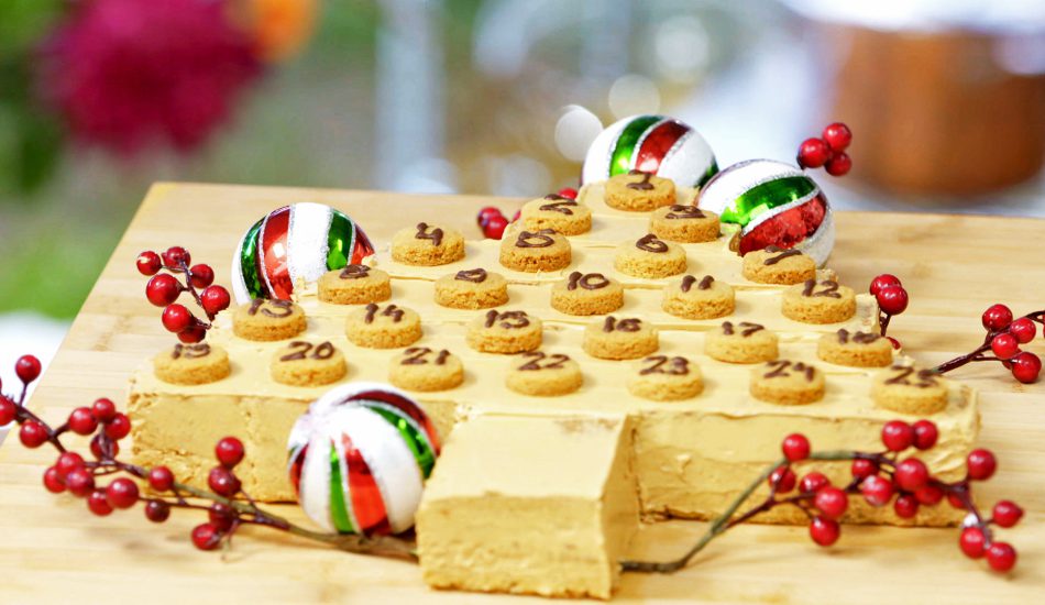 - Haal de taart uit de koelkast en bestrijk met een laatste laagje crème. Snijd de taart in 25 gelijke blokjes, plaats op ieder blokje een koekje en leg de blokjes in de vorm van een kerstboom neer.