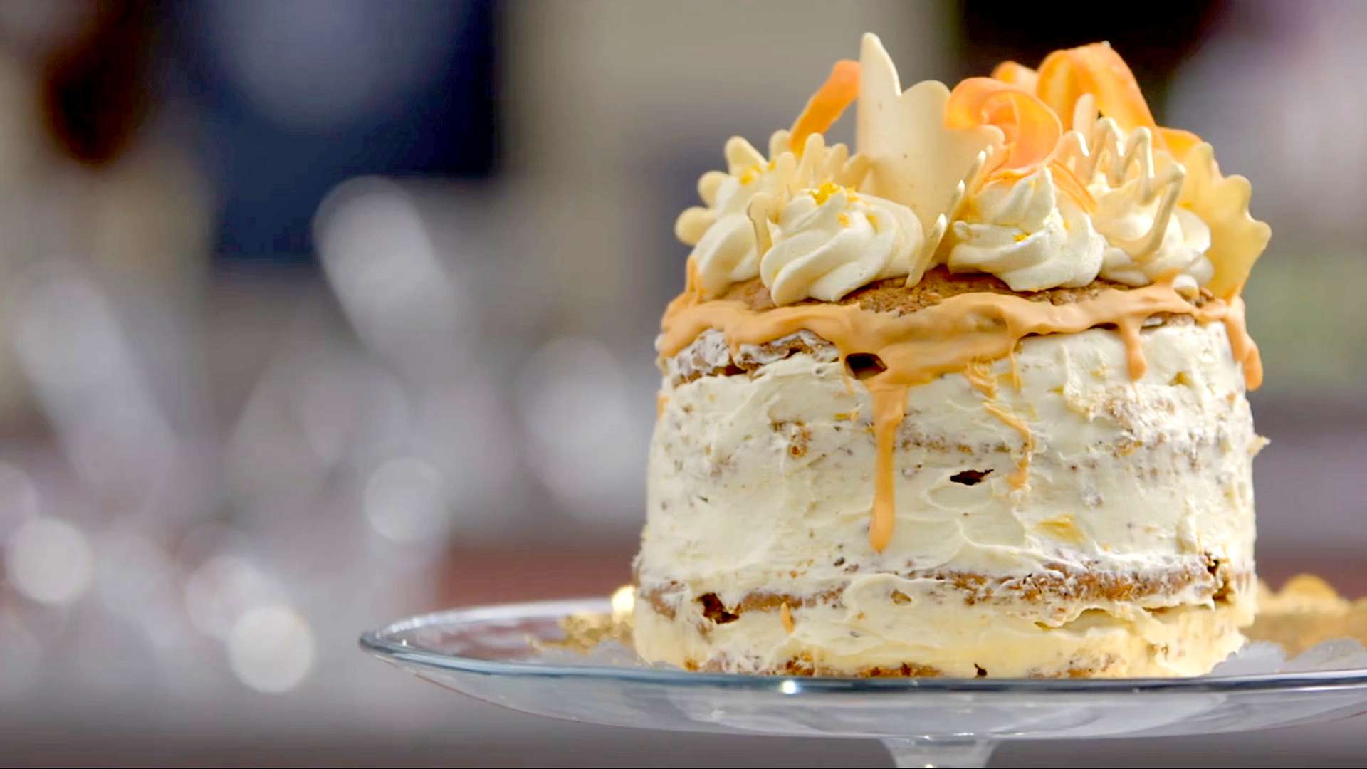 Deze oranjetaart maak je van een worteltaart in combinatie met allerlei Koningsdag-ingrediënten: kroontjes, sinaasappel én appeltjes van oranje.