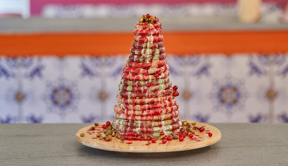 Mix de zoete smaak van deze Scandinavische kransekake met het zure van aalbessen en gezouten pistachenoten. “Echt super lekker”, aldus Robèrt.