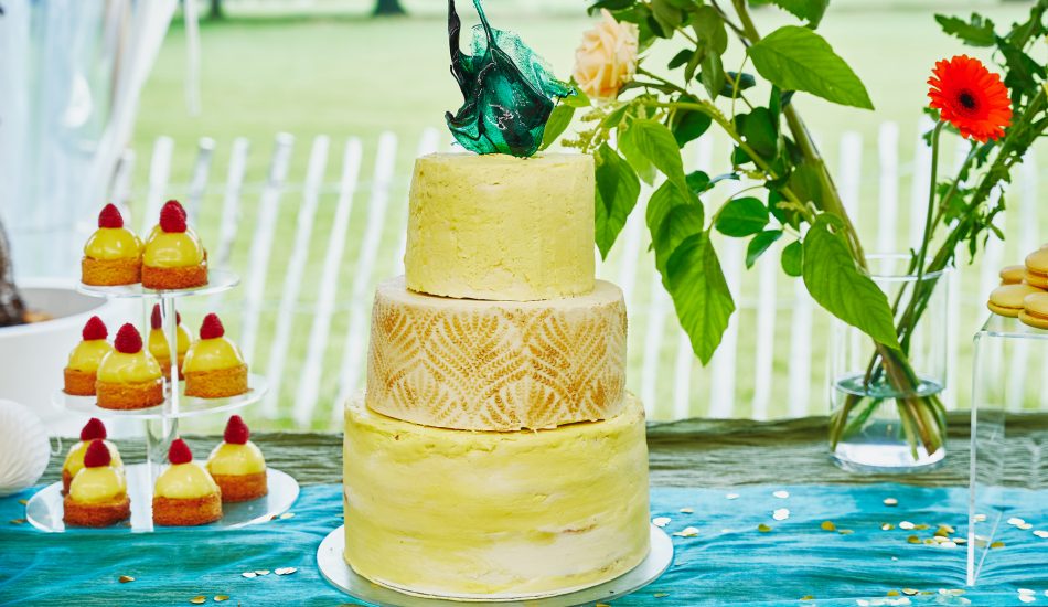 - Plaats het tule sjabloon op de taart en smeer het in met gele botercrème.