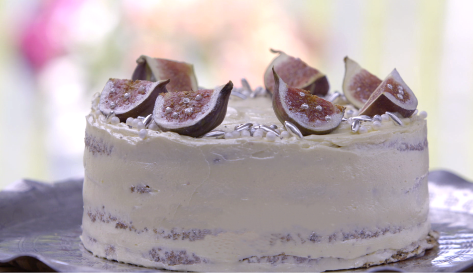 - Decoreer de taart met maanzaad, vijgen en zilveren versiersels.
