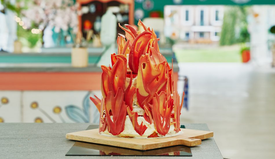 - Bouw de taart van groot naar klein op in taartringen en acetaatfolie.