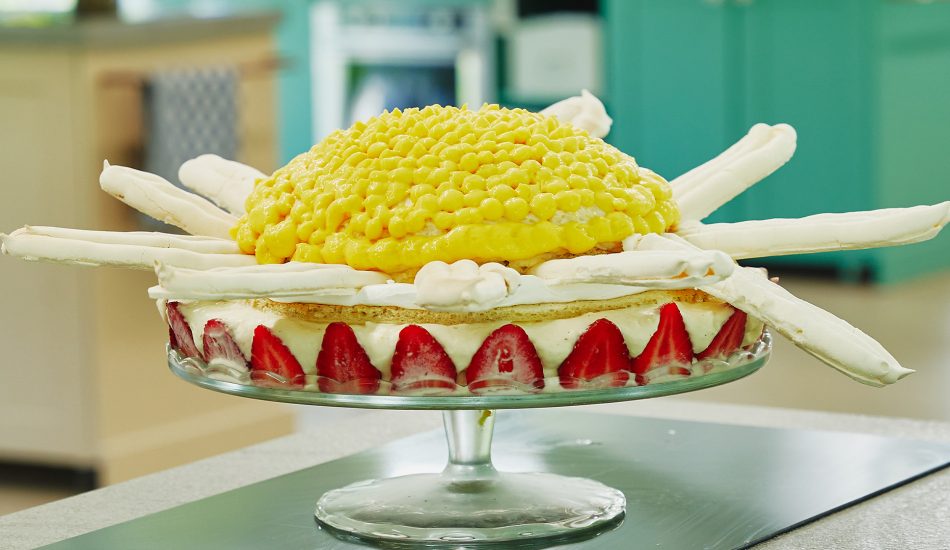 - Werk de taart af met meringueblaadjes die je rondom bloemenkern in de taart steekt.