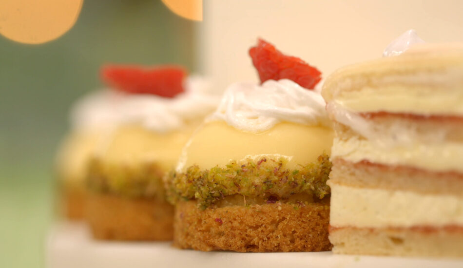Deze bolgebakjes zijn gemaakt van  sloffenbodempjes met kardemom, abrikoos-saffraanbavarois en granaatappelgelei. Volgens Janny zien de gebakjes er beeldschoon uit als je ze doorsnijdt. Een feestje voor het oog.