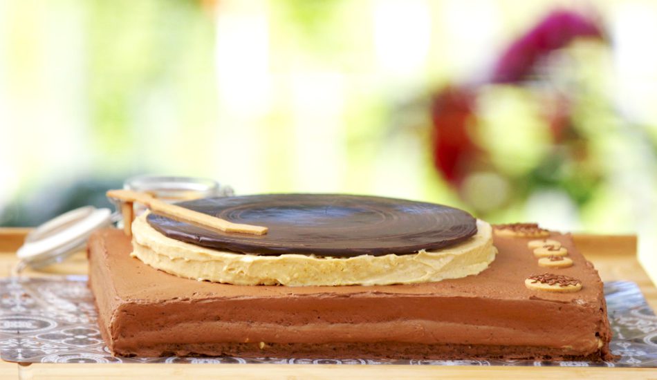 - Leg deze bovenop de met pralinecrème afgesmeerde cirkel. Steek de koekjes in de taart en maak er een platenspeler van.