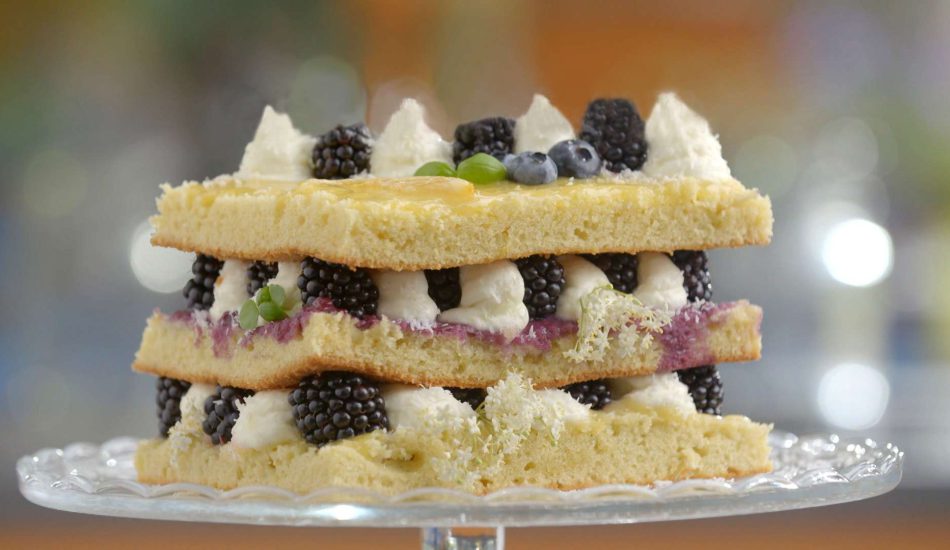 - Stapel nu de taart op: de laag met bosbes-bramen-crémeux komt in het midden