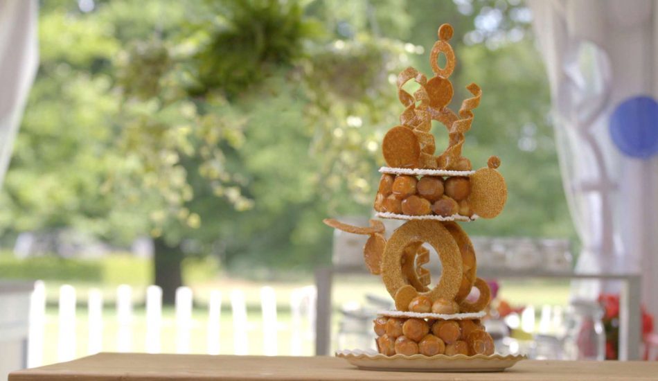 - Stapel een buitenrand van in karamel gedoopte soesjes, 3 hoog.