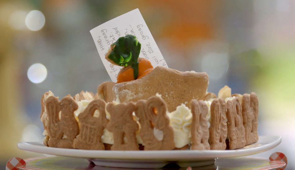 - Plak de speculaasjes met slagroom rondom de zijkant van de taart.
