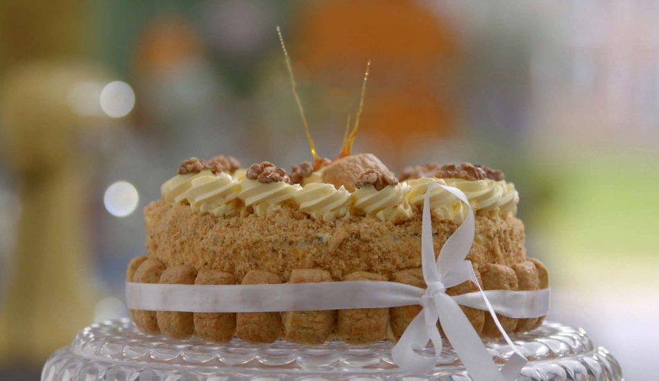 - Smeer na het aanbrengen van de laatste biscuitlaag de taart af met de botercrème.