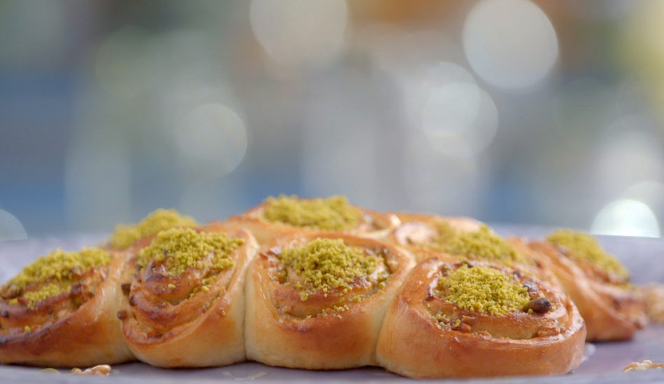 - Bestrooi het midden van elk broodje met een beetje fijngemalen pistache.