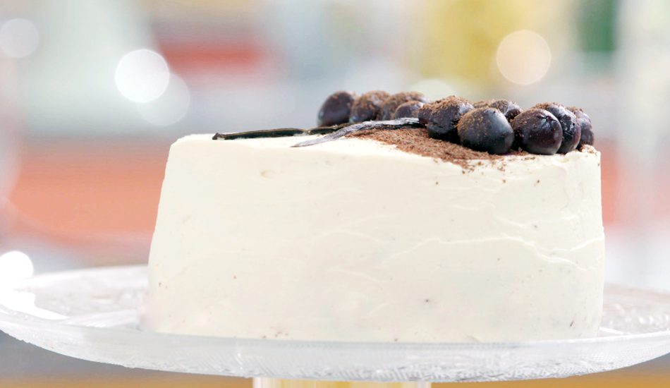 - Plaats de taart op een taartkarton en smeer de taart af met de mascarponecrème.