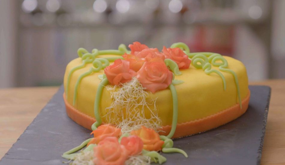 - Maak van de overige gele marsepein met een druppeltje rood een oranje lint om de taart heen.