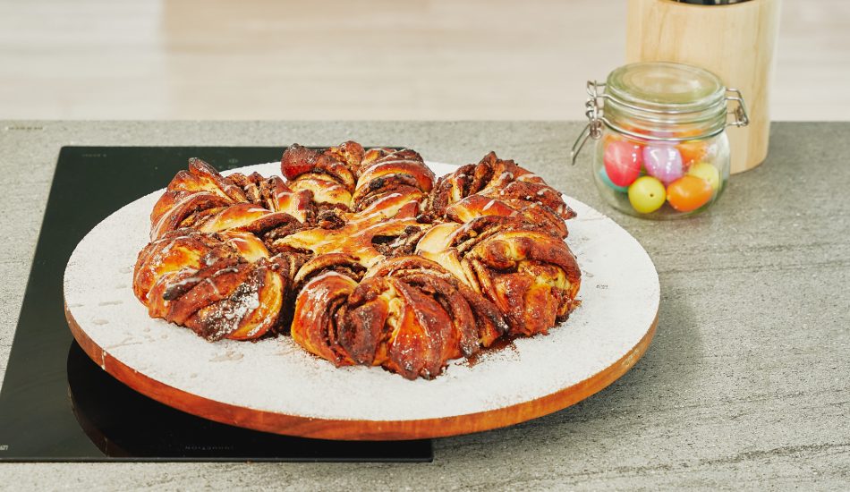 - Breng decoratief met een zigzag patroon aan over het brood.