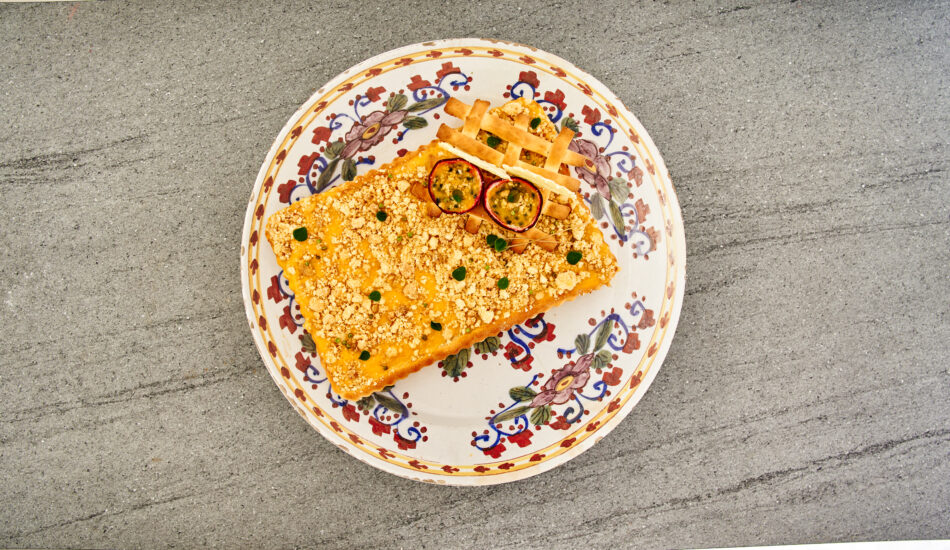 - Verkruimel een aantal Dushi Buttons over de passievrucht curd.