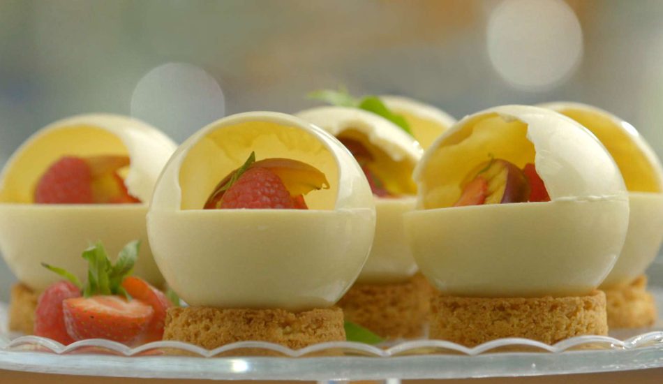 - Schep voorzichtig wat marmelade in kuiltjes van de perzikmousse met wat blokjes aardbei. Zet de mousse terug in de vriezer.