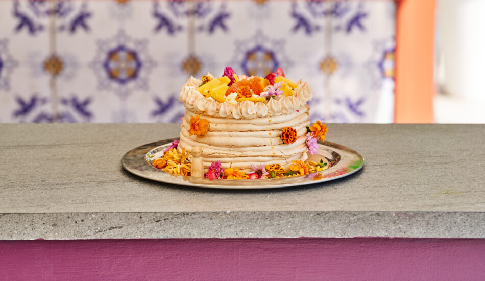 Van deze kleurrijke en fruitige polonaise word je direct enthousiast! De meringuetoren is gevuld met bloedsinaasappel curd, pina colada cremeux en versierd met eetbare bloemen.
