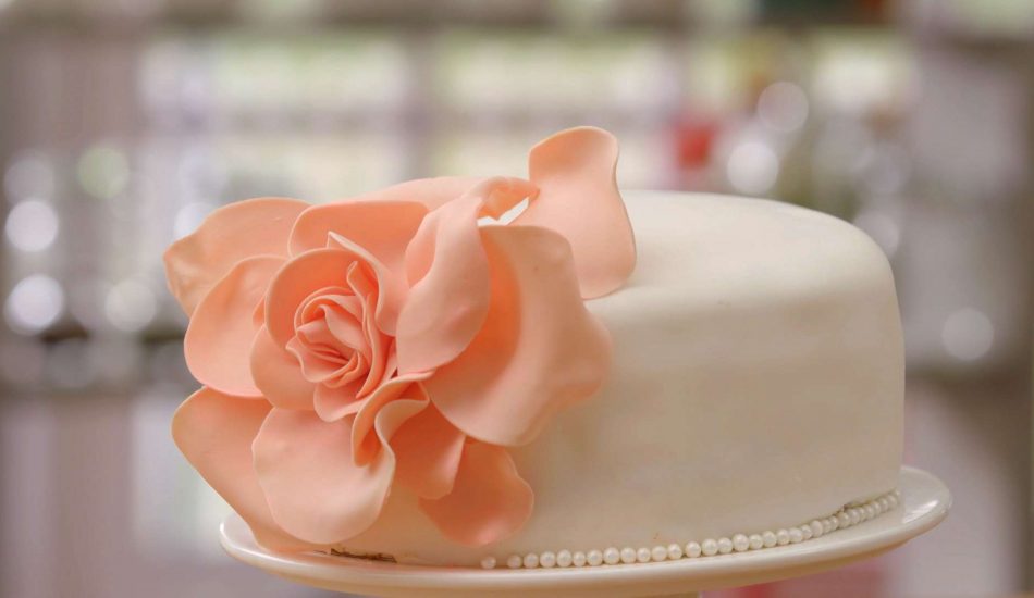 - Breng tussen de taartlagen de passievruchtcurd aan. Snijd aan één kant van de taart een ‘ellips’ uit. Bedek de taart met botercrème. Rol de fondant dun uit en bekleed de taart met fondant. Leg in de ellips de roos en om de roos de grotere bladen.