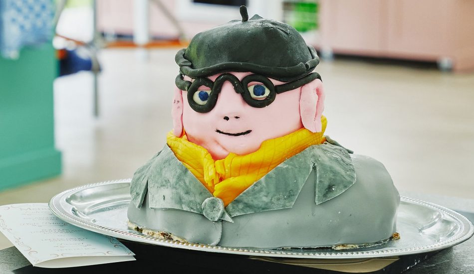 - Verdeel de fondant en maak de volgende kleuren: Klein beetje wit voor de ogen, roze voor de huid, grijs voor het jasje, zwart voor de baret en geel voor de sjaal.