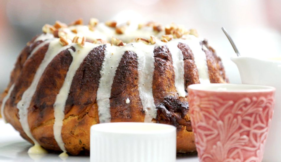 - Verdeel het glazuur over het brood en garneer met de pecannoten.