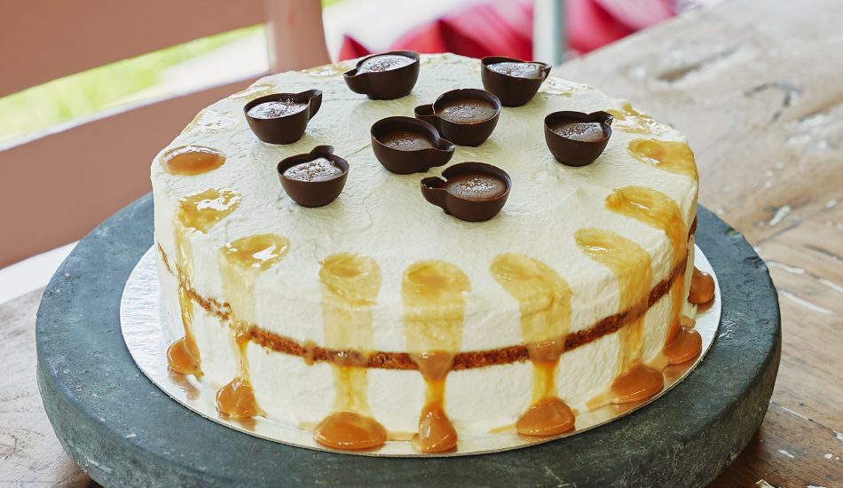 - Garneer de taart met bonbons, toefjes dulce de leche en toefjes hazelnootschuim.