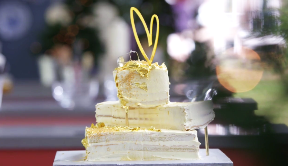 - Decoreer de taart naar wens met het bladgoud, pareltjes en gouden versieringen.