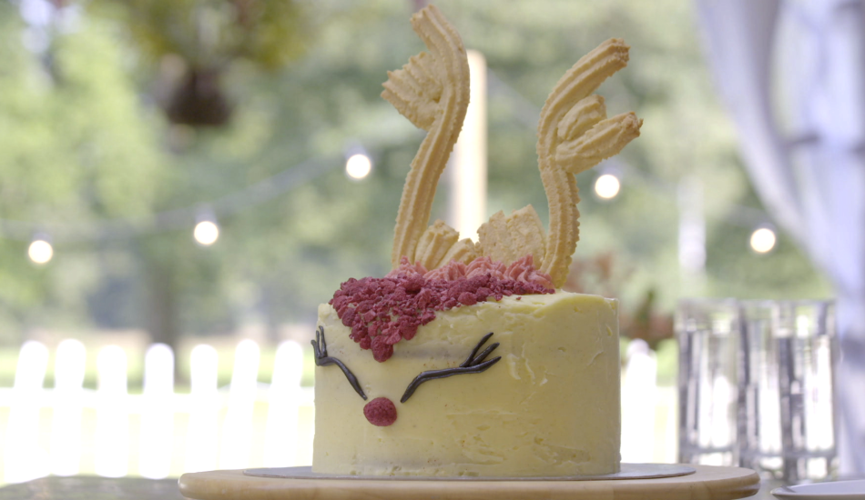 - Maak van de overgebleven frambozen-meringue botercrème toefjes van groot naar klein tussen het gewei richting de voorkant van je taart.