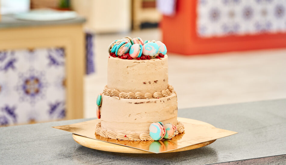 - Laat de Zwitserse meringue botercrème afkoelen tot de opbouw van de macarontaart.