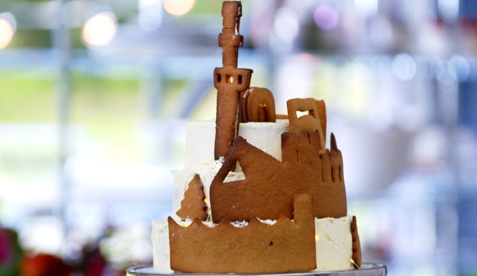 - Leg de koeken in de vorm van de Maas met meerpalen na het bakken op de vorm van de onderste cake-laag.