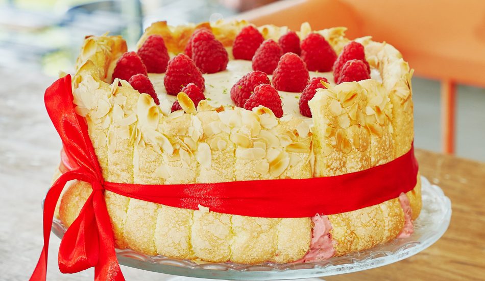 Deze Charlotte taart is een verrukkelijk exemplaar om te serveren als dessert. Hij is gevuld met frambozen en een sabayon met marsala wijn. Hij is lekker groot, dus je kunt er met een goed gezelschap van eten. Daar houden we van!
