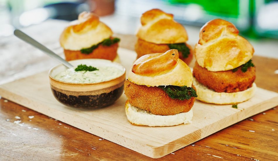 - Garneer de broodjes garnaalkroket met de mayonaise en de takjes gefrituurde peterselie.